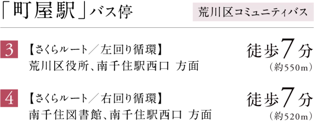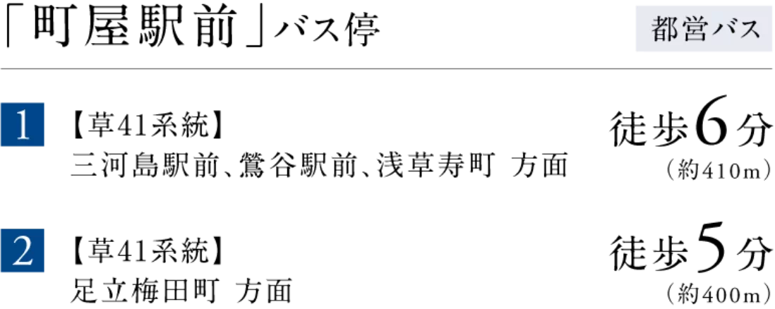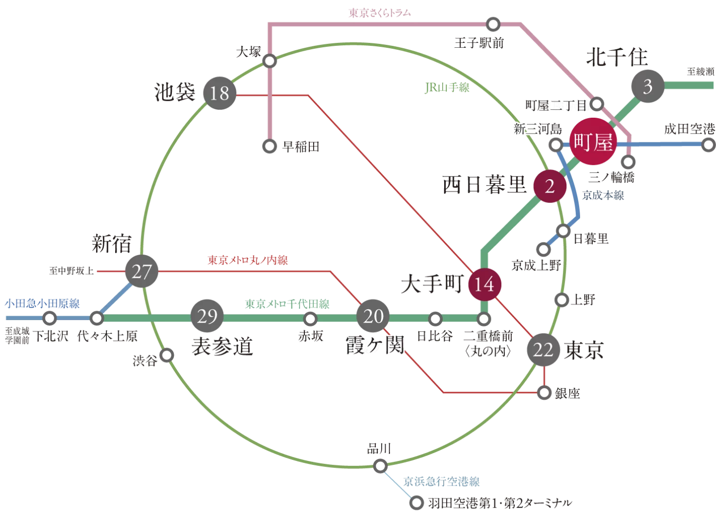 ※「北千住」駅:「町屋」駅より東京メトロ千代田線利用直通3分(3分)※「池袋」駅:「町屋」駅より東京メトロ千代田線利用、「西日暮里」駅よりJR山手線乗換え18分(18分)※「霞ケ関」駅:「町屋」駅より東京メトロ千代田線利用直通20分(18分)※「東京」駅:「町屋」駅より京成本線利用、「日暮里」駅よりJR山手線乗換え22分(21分)※「表参道」駅:「町屋」駅より東京メトロ千代田線利用直通29分(26分)※掲載の路線図は一部路線・駅などを抜粋して表記しています。交通所要時間は朝の通勤時(7:30~9:00)、()内は日中時(10:00~16:00)目的駅着の電車のもので、曜日・時間帯により多少異なる場合がございます。また、乗換え・待ち時間を含みます。2025年6月時点のダイヤによるものです。(「ジョルダン」調べ)