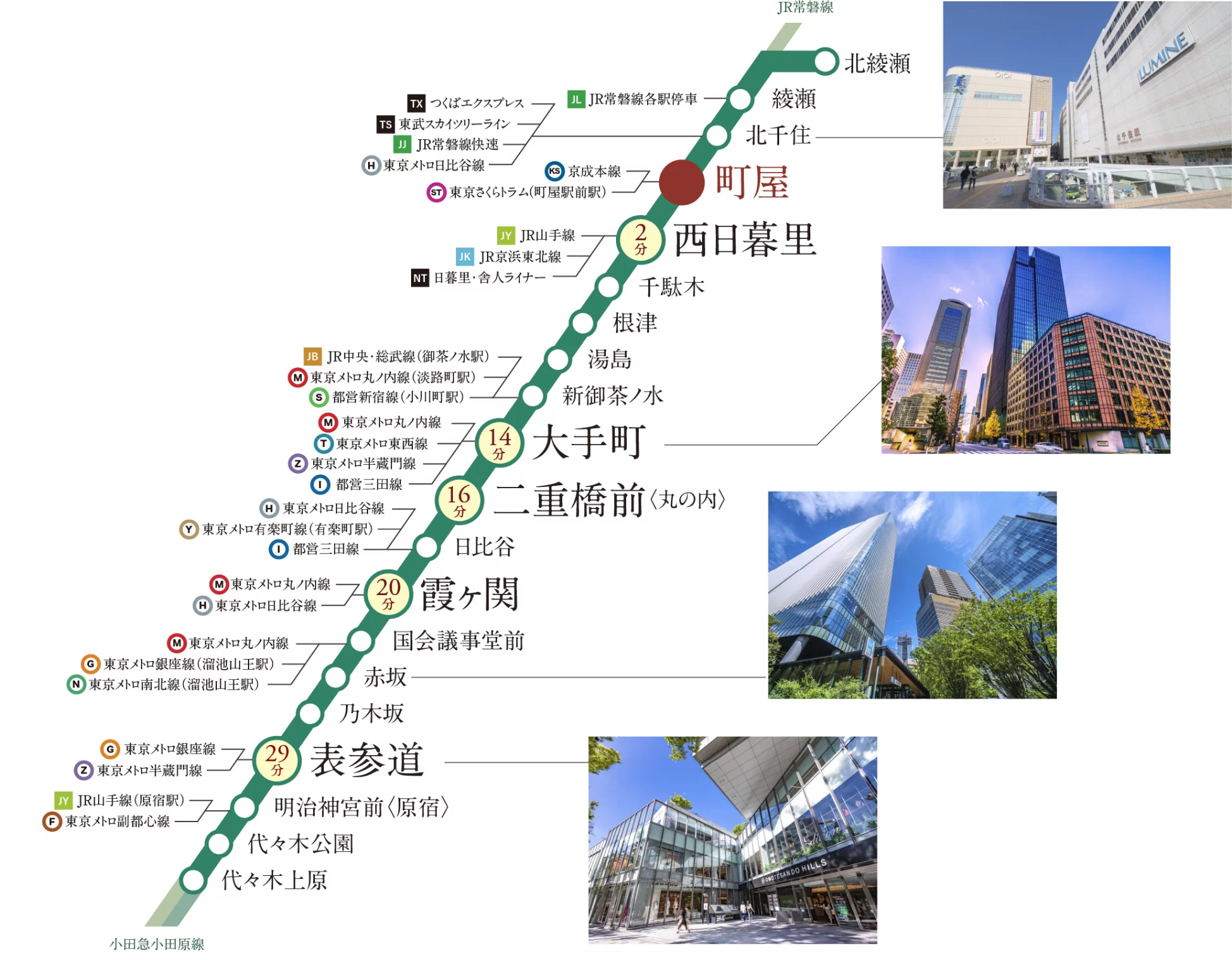 東京メトロ千代田線で「大手町」駅まで直通14分、「二重橋前<丸の内>」駅にもダイレクトアクセスし、
