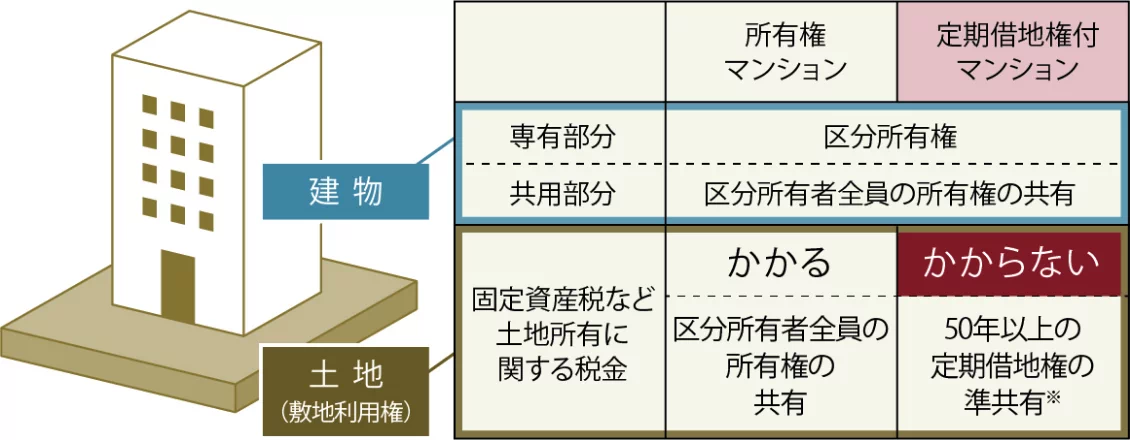 「定期借地権付マンション」とは、土地に権利設定した「定期借地権」で敷地を利用するマンションです。建物は通常のマンションと同様に購入し、土地は地主から期限付きで借りて「利用」する点が最大の特徴となります。土地の固定資産税等がかからない代わりに、土地の利用料として「地代」を支払います。