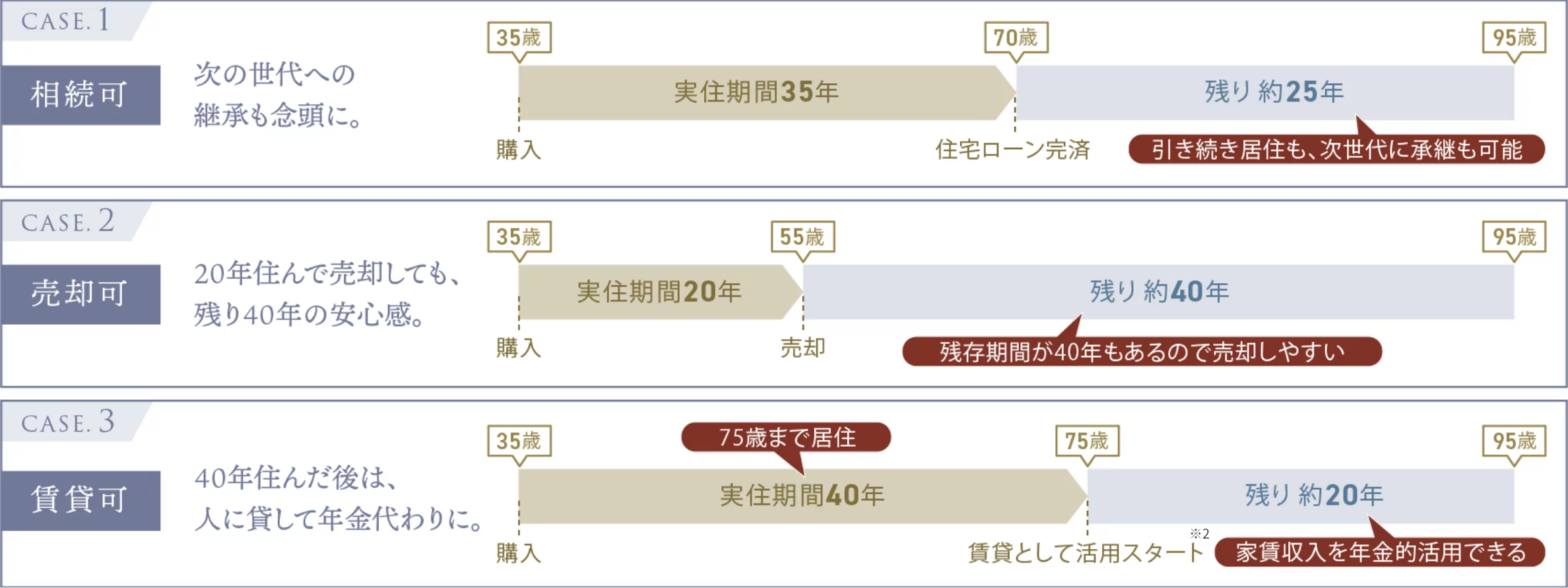 約60年※1という長期設定の定期借地権マンションなら、過去の購入者様から「建物の寿命を考えてもちょうどよい」「20年住んだあとに売却しても、まだ約40年残っているから安心」という評価の声も。