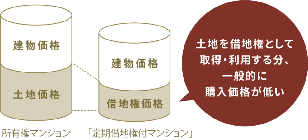 土地を所有権として購入しない分、住宅の購入価格を抑えることができ、資金に「ゆとり」ができます。同じ予算でも利便性の高い立地や、条件の良いお部屋が選べるなど、マンションの選択肢の幅が広がります。その合理性こそが「定期借地権付マンション」の魅力のひとつです。