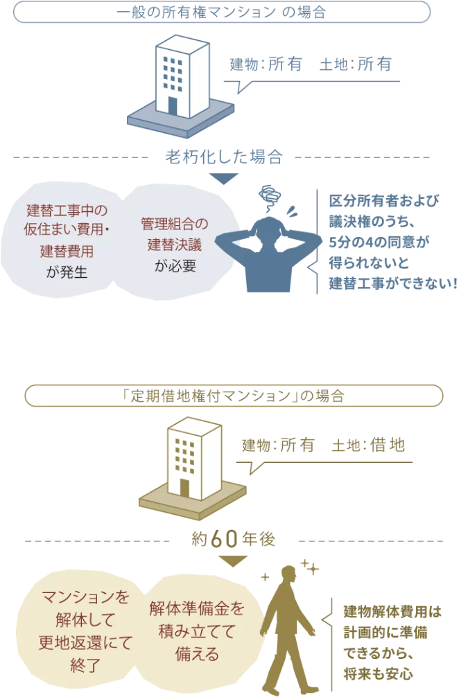 「定期借地権付マンション」は、期間満了時までに建物を解体し、土地を更地で返還することが原則です。土地に期限があるため、必要な修繕を計画的に行えます。また、住民の4/5以上の合意が必要とされる建替えに向けた調整も不要です。