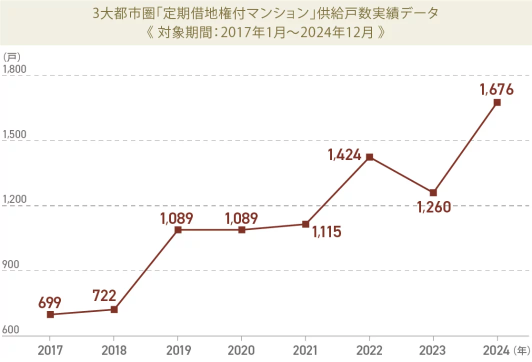 3大都市圏(東京・大阪・名古屋)の「定期借地権付マンション」は近年増加傾向にあります。2024年の供給戸数は2017年と比べると約2.4倍の1,676戸供給されています。土地を有効利用する合理的な住まいの形として、「定期借地権付マンション」は、徐々に供給戸数を増やしています。