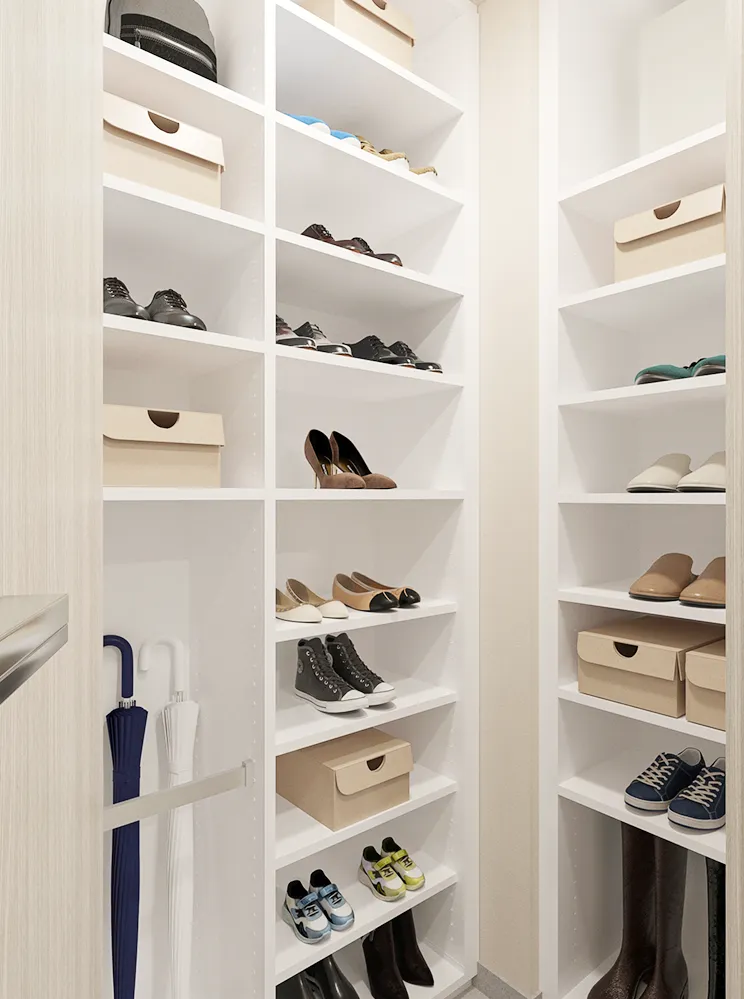 家族の会話が生まれやすい対面キッチン。ウォークインクロゼット・シューズインクロゼットとあわせて廊下やリビング・ダイニングに物入を効率的に配置。